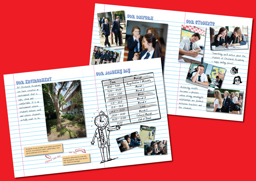 To make a school prospectus look a bit different from all the others, we came up with the idea of making it look like an exercise book, complete with doodles! The scrapbook design, handwriting fonts and of course the doodles feature throughout. A couple of years later we were approached by Elizabeth Garret Anderson School in Islington who asked us to produce something similar for them.