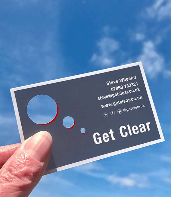 A business coach, who had set up a new venture called Get Clear, asked us to come up with some branding. That got us thinking. Then we had a thought... thought bubbles! But not just any thought bubbles... die cut thought bubbles! That takes Get Clear to a hole new level! We thinks!